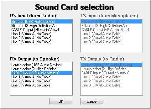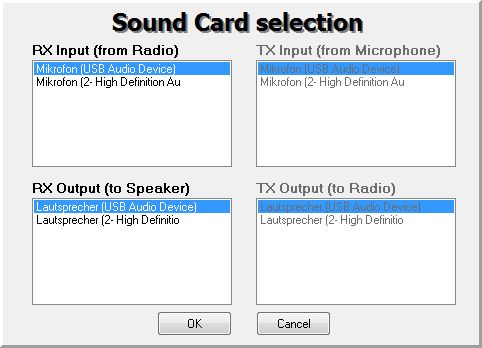 Ich klicke bei "RX Input" auf "Mikrofon (USB Audio Device)", bei "RX Output" auf (Lautsprecher (USB Audio Device).