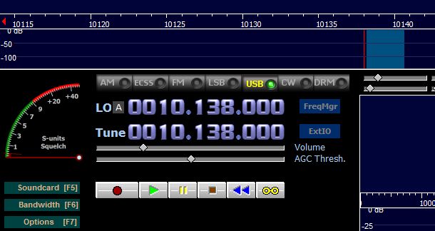 Nun stellt sich die Frage, auf welchem Amateurfunkband Betrieb ist und wie man das Programm auf die entsprechende Frequenz einstellt. Der Funkbetrieb auf Amateurfunkbändern kann in 24h sehr unterschiedlich ausfallen. Aktuell (Ende 2016) ist die Situation, dass nur nachts auf dem 80m-Band internationale Verbindungen möglich sind, während nur tagsüber auf dem 15m-Band internationale Verbindungen möglich sind. Es ist aktuell Tag und ich probiere das 30m-Band aus und möchte dort JT65-Signale empfangen und dekodieren lassen. Die JT65-Funker treffen sich auf der Frequenz 10.138Mhz/USB. Das kann nun schon mal eingestellt werden (erfolgversprechende Alternativen wären auch noch: 14.076MHz, 21.076MHz), das Programm hat sich bei einem Neustart die letzten Einstellungen gemerkt. Mit der rechten Maustaste kann man den Frequenzanzeiger in HDSDR um einen runterzählen lassen (man kann sofern vorhanden auch mit dem Mausrad die Frequenz schneller einstellen).
