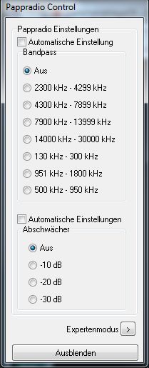 Nun verbinden Sie das Pappradio, oder eben Ihren SDR, mit einem USB-Kabel mit Ihrem Rechner. Installieren Sie bitte noch keine(!) Antenne, es soll noch einmal kontrolliert werden, ob der SDR "Eigensignale" erzeugt, die nichts mit dem Empfang an der Antenne zu tun haben können. Starten Sie anschließend HDSDR. Nach dem Start von HDSDR sollte keine weitere Meldung erfolgen. Beim Pappradio ist ziemlich genau in der Mitte des Programms ein weiss aufleuchtender Button "ExtIO". Klicken Sie den Button "ExtIO" an. Klicken Sie die automatischen Einstellungen weg, so dass beide Optionen auf "Aus" stehen, danach blenden Sie dieses Fenster aus.