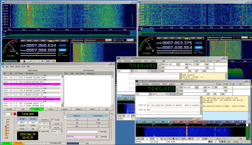 HDSDR: 2x gestartet, eingestellt auf das 40m-AFU-Band. Die JT65-Signale werden im linken HDSDR-Fenster vom Frequenzausschnitt, der sich blaß hellblau unter dem oberen Wasserfall ganz rechts abzeichnet, erfasst. Dieses Audiosignal gibt HDSDR auf der virtuellen Schnittstelle "Line1" aus und wird wiederum als "Line1" am Autioeingang von WSJT-X abgegriffen (ist hier nicht zusehen). Der HDSDR im rechten Fenster ist auf die Frequenz für PSK-Signale eingestellt, diese werden vom Frequenzausschnitt ganz links erfasst, auf der virtuellen Schnittstelle Line2 ausgegeben und dann gleich zwei Mal von fldigi abgegriffen, einmal fürs Dekoden von PSK31-Signalen (dort ist im gelben Fenster etwas Text zu sehen) und einmal fürs Dekoden von PSK63-Signalen.
