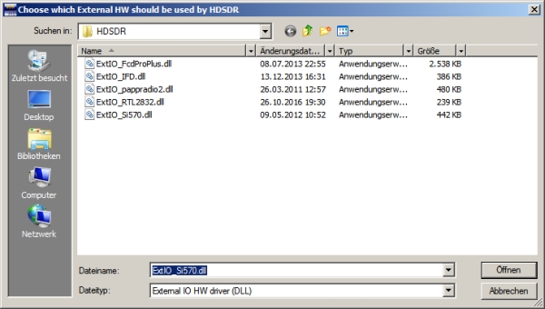 HDSDR: Nach Aufruf von HDSDR wird als erstes abgefragt, welche SDR_DLL eingebunden werden soll. HDSDR durchsucht automatisch das HDSDR-Verzeichnis nach solchen DLLs für SDR.