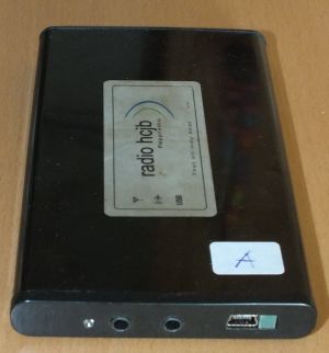 Pappradio: Das Audiosignal muss wie bei einem KW-Radio per Audiokabel vom Kopfhörerausgang (mittlere Buchse, 3.5mm) dem PC zugeführt werden. Buchse links: Antenne (3.5mm), Buchse rechts: USB.