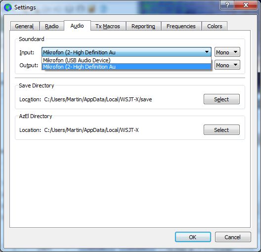 WSJT-X: Audioeingang aus einer USB-Quelle (in diesem Falle ist es der FiFi-SDR).