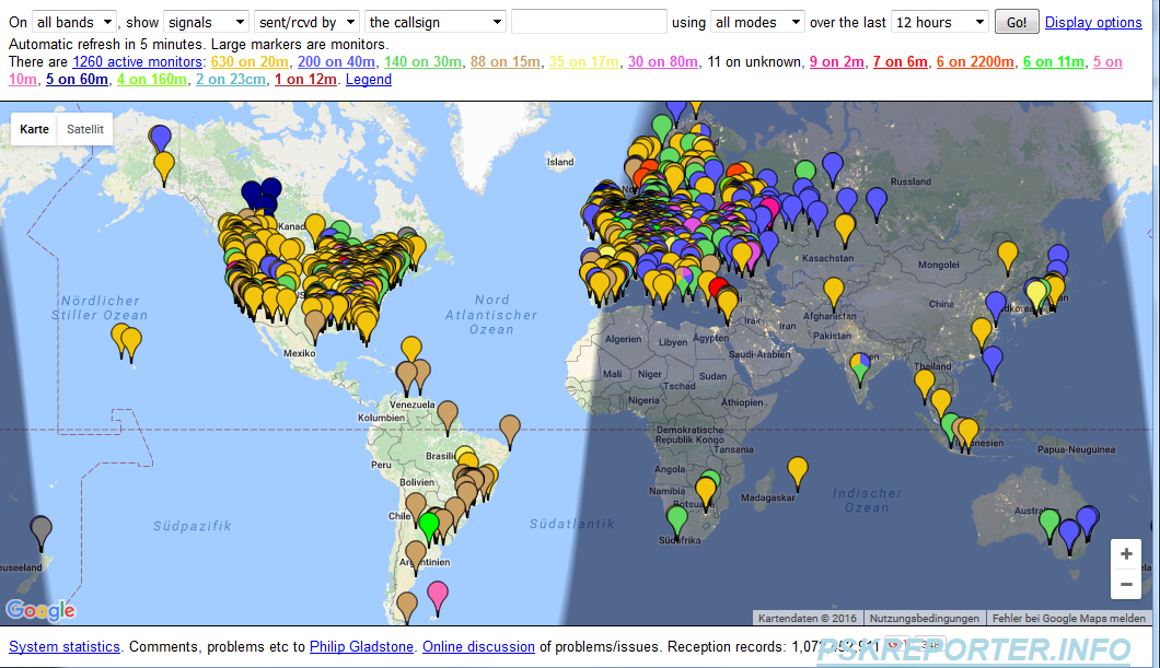 Spielen Sie nun eine zeitlang mit dem PSK-Reporten und den verschiedenen Optionen im Kopfbereich herum. Ändern Sie mal das Amateurfunkband oder die Digitalfunk-Art, um zu verstehen, was der PSK-Reporter an Möglichkeiten bietet.