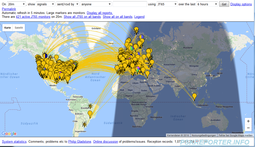 PSK-Reporter: Digitalfunkaktivitäten im Modus JT65 der vergangenen sechs Stunden im 20m-Amateurfunkband