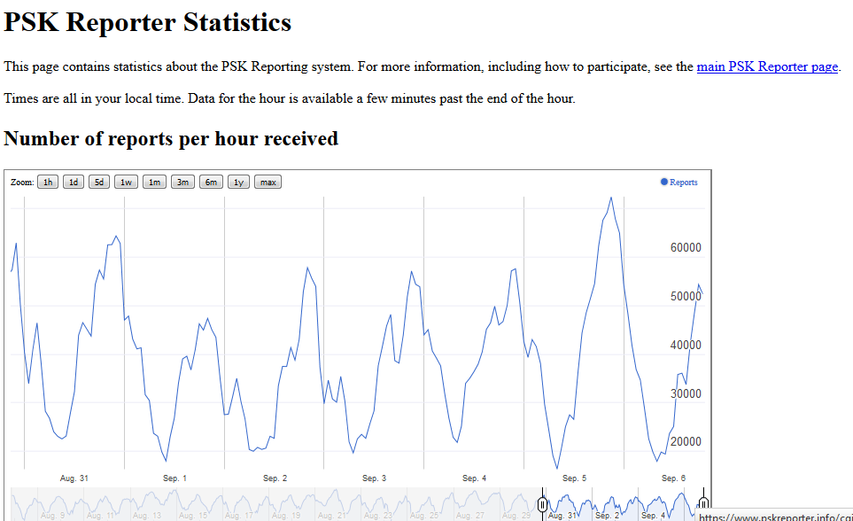 PSK-Reporter, "System statistics": Am Vortag trafen mit 70.000 Stück pro Stunde relativ viele Empfangsreporte ein.