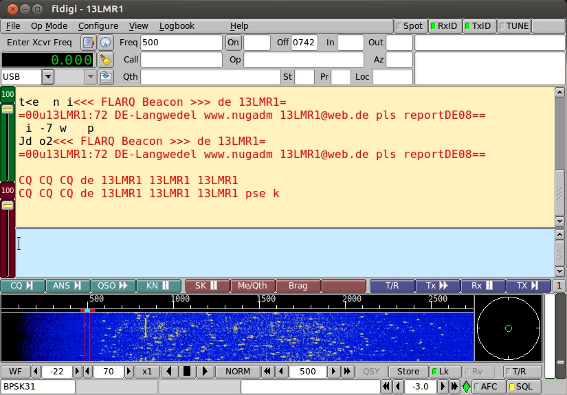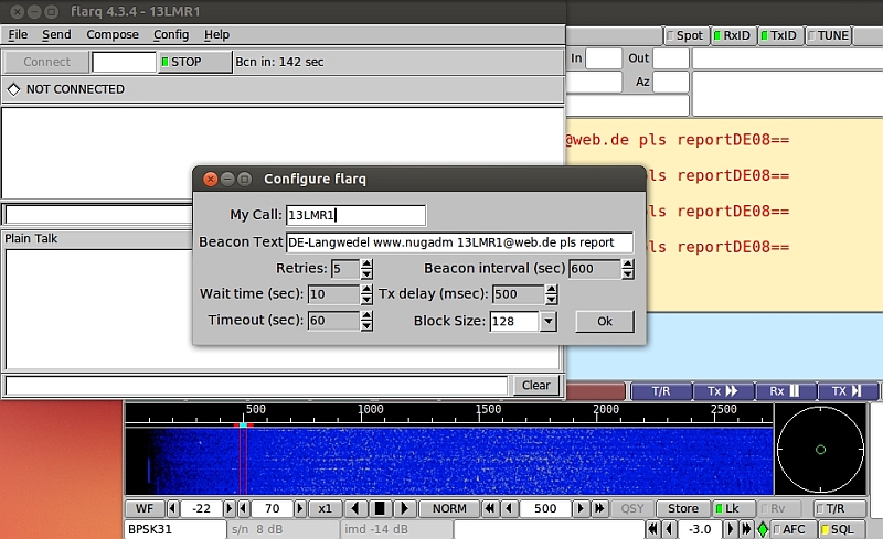 Zweite Möglichkeit, ins PSK-Funken im CB-Funbereich zu kommen: Sie können mit dem Programm flarq eine periodisch sendende Funk-Bake benutzen, die im Baken-Text den Wunsch nach einem Report (QSL) enthält. Flarq setzt auf fldigi auf. Stellen Sie über fldigi den Modus (etwa bpsk31) und die Mittenfrequenz (etwa 500Hz) ein. Aus dem Amateurfunkbereich stammt die Konvention, dass die Digitalbetriebsarten auf den unteren Funkfrequenzen zu finden sind. Die Mittenfrequenz einer Bake "nach unten" auf 500Hz zu legen - und nicht in die Mitte eines Kanals (bei 1500Hz)- ist insofern auch ein freundliches Verhalten, weil damit der Kanal für weitere Funkkontakte oder andere Betriebarten genutzt werden kann. (Auch für CB-Funker können die Gedanken der Bandbelegung ganz interessant sein, die man sich im Amateurfunkbereich zur Regelung der Nutzung eines Frequenzbereiches für die verschiedenen Betriebsmodi gemacht hat (Kurzwellen-Bandplan (DARC)). Eine noch tiefere Mittenfrequenz als 500Hz zu nutzen, wäre sicher noch freundlicher, aber das erlaubt fldigi nicht.