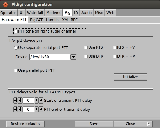 Natürlich muss auch der Typ des Interfaces, in diesem Falle "PTT" konfiguriert werden, das signaLINK ist ein PTT-Interface. Hier treffen die Voreinstellungen von fldigi zu, es sind in der Regel keine weiteren Angaben nötig. (Vielleicht nur noch der Hinweis auf den Reiter "HAMlib", mit dem aus einem Katalog an Konfigurationsmöglichkeiten für CAT-Interfaces marktgängiger Funkgeräte das passende ausgewählt werden könnte.)