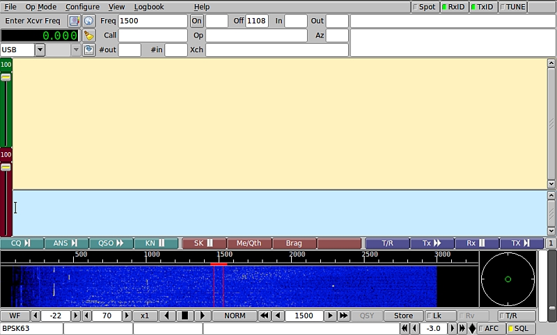 Ganz links steht der aktuell eingestellte Betriebsmodus, in diesem Falle ist das "bpsk63". In der Mitte der Zeile steht "1500", das ist die aktuelle eingestellte Mittenfrequenz, auf der fldigi nach Signalen im Format bpsk63 lauscht. Die beiden roten Striche zeigen an, wie schmal das Signal ist, dass hier erwartet wird. Wenn ich jetzt senden würde, würden die Daten ebenfalls in diesem Bereich der Mittenfrequenz 1500Hz sowie beim Betriebsformat bpsk63 mit minus 31.5Hz und plus 31.5Hz ausgesendet werden. Mit den Pfeilen rechts und links von der Einstellung der Mittenfrequenz (hier "1500") lässt sich der rote Empfangsbalken (der auch eine Sendebalken ist) in 1 oder 10Hz-Schritten nach links und rechts verschieben.