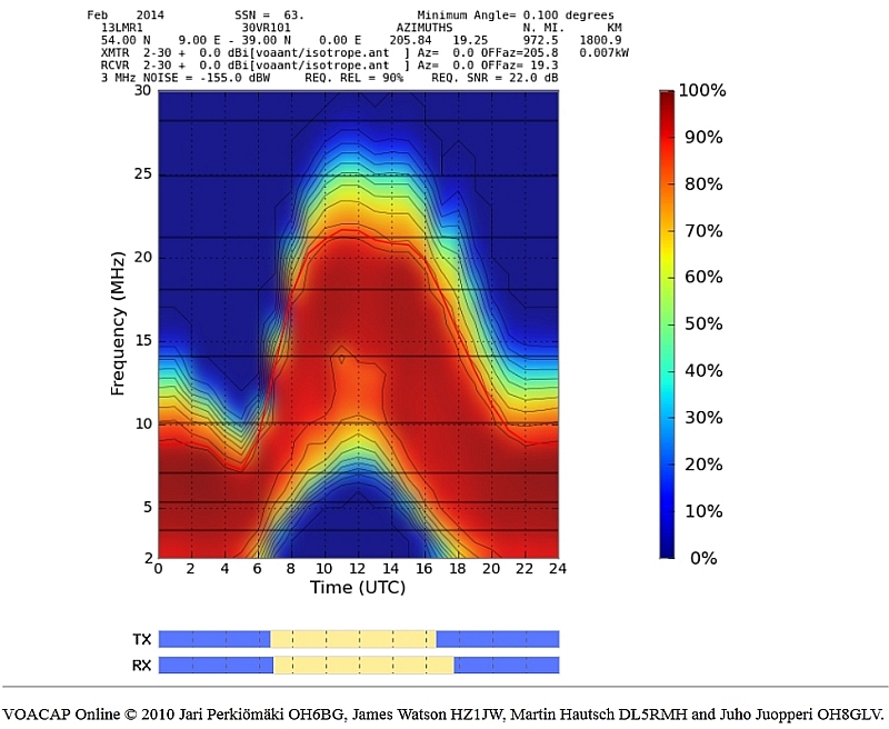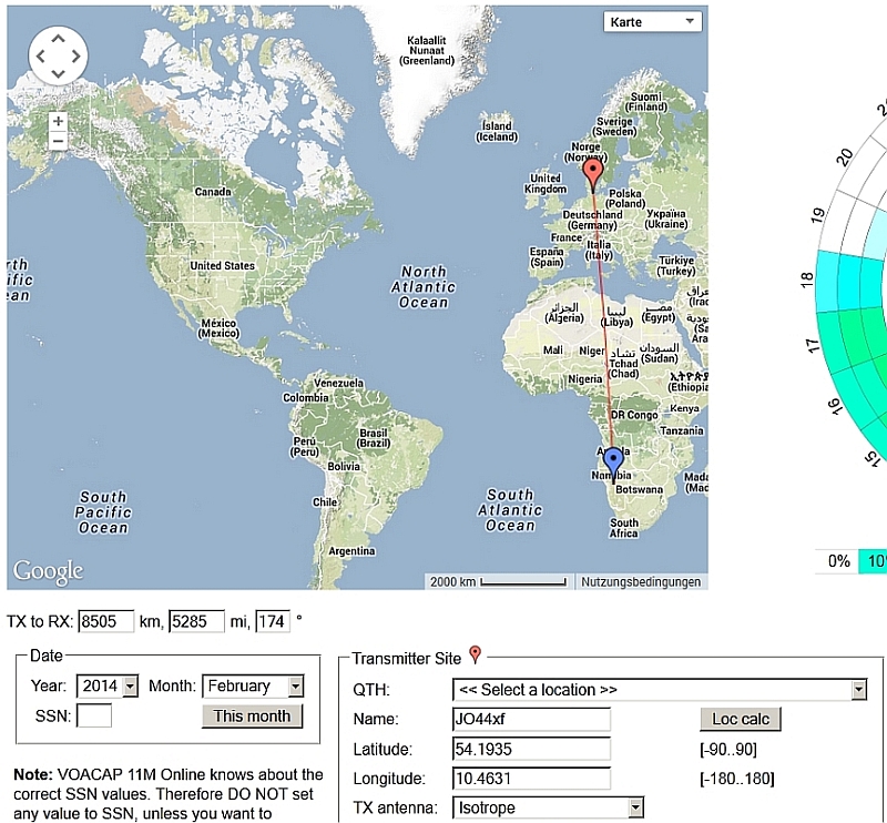 Geht es komfortabler? Ich habe meine GPS-Koordinaten angegeben und stelle fest, dass eine kleine Chance für weltweiten Funkkontakt zwischen 10 und 16 Uhr besteht. Auch wenn mich die Frage interessierte, unter welchen Bedingungen ein Funkkontakt zwischen genau zwei Punkten auf der Welt im möglich wäre, so kann mir voacap weiter helfen, wie sich der folgenden Grafik am Beispiel einer Funkverbindung zwischen Langwedel und Windhuk entnehmen lässt.