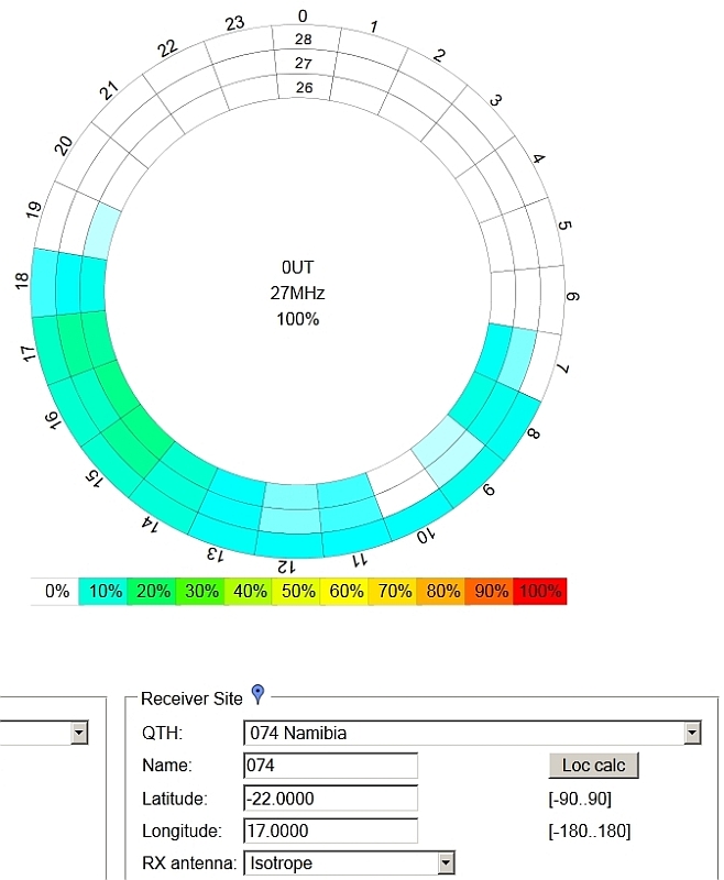 Um sich über die wahrscheinlichen Ausbreitungsbedingungen eines Tages informieren zu können, sollte man die Webseite von Voice-Of-America: Prognose für Ausbreitungsbedingungen von Funkwellen kennen. Man kann sich hier zu jedem Punkt der Erde die Chancen nennen lassen, in welchen Zeiträumen und in welchem Funkfrequenzbereich weltweite Funkverkehrsverbindungen zustande kommen können. Nun sind wir im legalen CB-Funkbereich auf die Frequenz 27Mhz festgelegt, können also nicht wie die Funkamateure auf Frequenzen mit besseren Reichweitechancen ausweichen. Aber gerade weil wir nur so beengt agieren dürfen und das Band derzeit tagsüber oftmals nur für wenige 10-Minuten offen ist, um Verbindungen nach Australien, Mexiko, oder nach Spanien, Frankreich, Polen oder in die Ukraine aufnehmen zu können, lohnt ein Blick auf die Prognosekarten. (Radio Mobile - Windows-Programm zur Reichweitenermittlung für Bodenwelle).