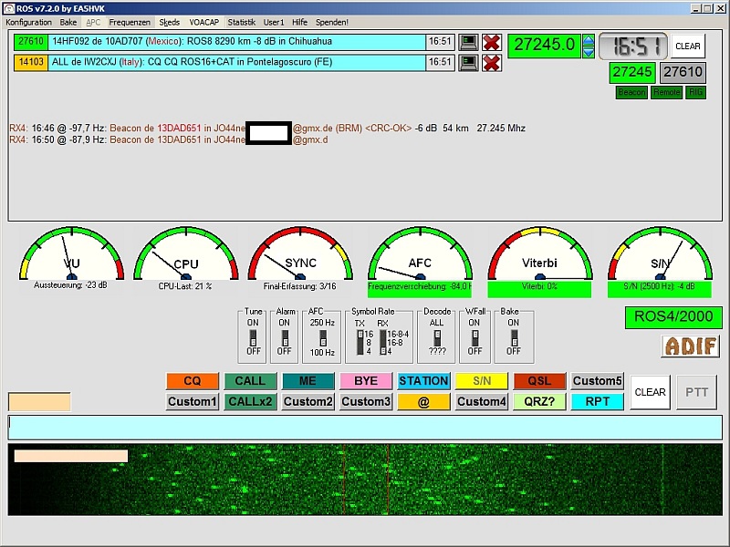In dem Fenster oberhalb der Reihe mit den Instrumenten erkennt man die beiden Zeilen, die den dekodierten Text anzeigen. Es handelt sich um eine Bake, also eine automatisierte Textaussendung, die von der Station mit dem Rufzeichen "13DAD651" stammt, die ihren Locator mitschickt sowie eine E-Mailadresse, an die man eine Empfangsbestägigung schicken kann. Die Signalstärke wird mit "-6dB" angegeben, was für andere Betriebsarten kaum mehr verarbeitbar wäre. Die Station befindet sich 54km von der meinen entfernt und sendet auf 27.245MHz. Diese Bake war das erste ROS-Signal, das über meine Funkanlage abends empfangbar war. Tagsüber braucht es keine solche "Nachbarschaft", da kommen ROS-Signale aus aller Welt laut rein. Zuletzt noch zu den beiden oberen hellblauen Zeilen... diese zeigen an, dass zwei Stationen im Amateurfunkbereich eine ROS-Verbindung aufbauen möchten. Diese Daten werden per Internet zugespielt. Bei gutem Funkwetter weiss man dadurch, auf welche Gegenstationen man hoffen darf.